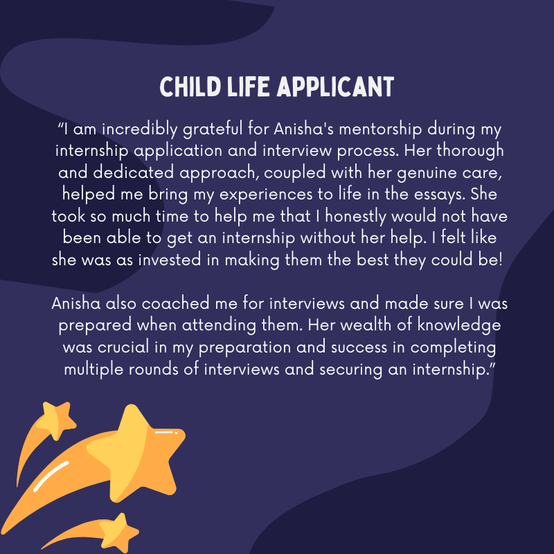But control what you can and the structure isn't one of them. So apply everything I talked about above, speak confidently about the great experiences you've had that taught you a skill that transfers to child life, stay organized, and rest in between. Interview season is tough whether you're getting a few or tons of invites. I hope to see the field find a way to improve the heaviness of the process for students, but in the meantime, practice your self-care routine heavily and speak kindly to yourself. Statistically, landing an internship is extremely difficult. Would love to help you nail your interviews when you sign up for a subscription!
