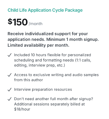 Paid subscription tiers will provide you with exclusive content including access to this author's audio recordings and seminars of how to interview with confidence to be yourself while answering questions professionally, succinctly, and memorably. You will also gain full access to read this author's writing samples from applications to medical school and child life clinical experiences.