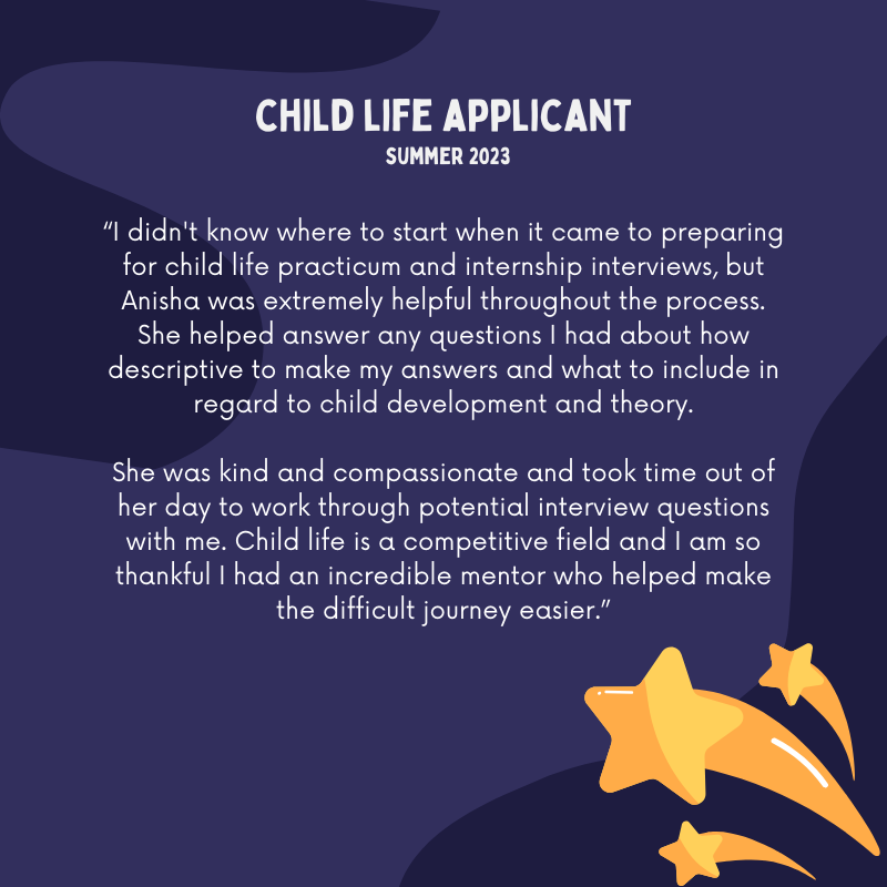 This is a competitive field to get into and that is why my goal is to support child life students during what can be a grueling application cycle. At Southeastern Association of Child Life Professionals (SEACLP) 2023 conference, I was attending a session by Briana Keller presenting initial results of the fall 2023 applicant survey. Imagine my shock when I looked at the screen knowing that was my own quote 😅